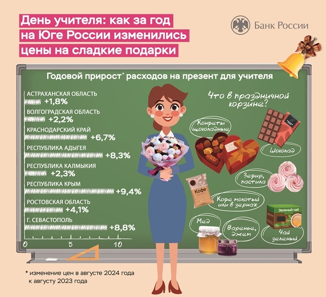 Традиционно учителям дарят цветы, но популярен и более креативный вариант подарка, например, набор из сладостей, чая и кофе. Эксперты Банка России, используя данные Росстата, выяснили, как за год в регионах Южного федерального округа изменились цены на товары, которые можно выбрать в качестве вкусного презента ко Дню учителя.