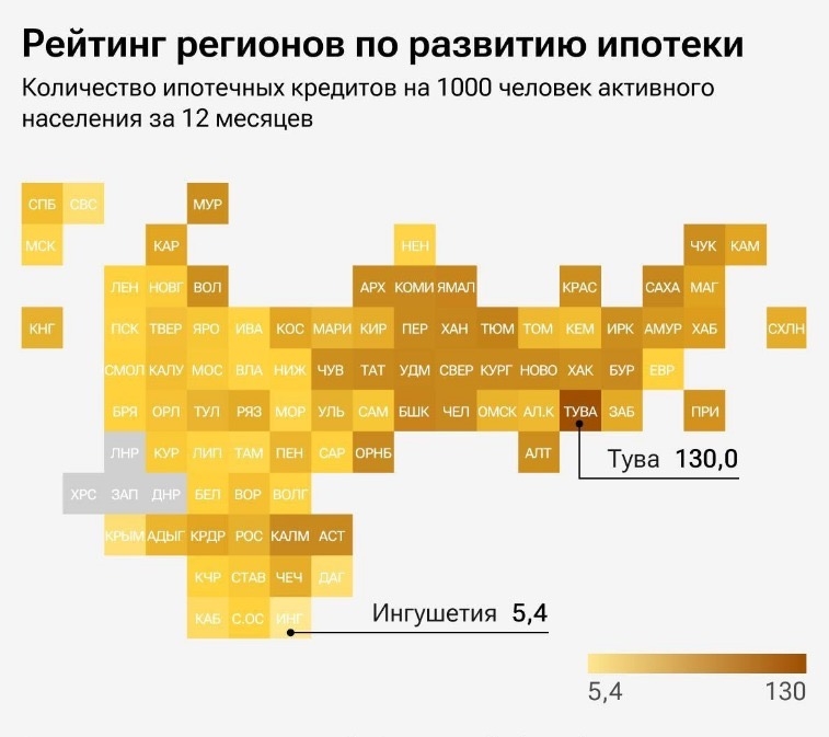 За последние 12 месяцев в России выдано рекордное количество ипотечных кредитов. В среднем по стране 25 человек из тысячи экономически активного населения взяли займы на покупку жилья (в 2015 году данный показатель равнялся десяти). Тува, Тюменская область и Ямало-Ненецкий автономный округ лидируют в рейтинге регионов по развитию ипотеки. В аутсайдерах - Ингушетия, Крым и Севастополь. Самые крупные кредиты берут в Москве (6,97 млн рублей), Московской области (4,9 млн рублей) и Санкт-Петербурге (4,9 млн рублей).