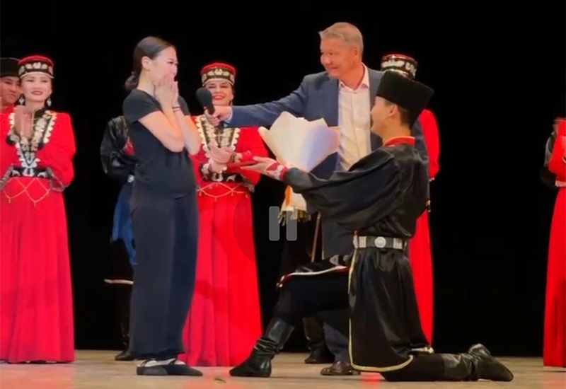 Артист Государственного театра танца Калмыкии «Ойраты» Андрей Очир-Горяев сделал предложение руки и сердца прямо на сцене театра оперы и балета во время гастрольного концерта в столице Бурятии.