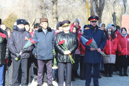 Отдавая дань уважения павшим при исполнении воинского долга, присутствующие почтили их минутой молчания и возложили цветы и венки к подножию мемориала «Вечный огонь».