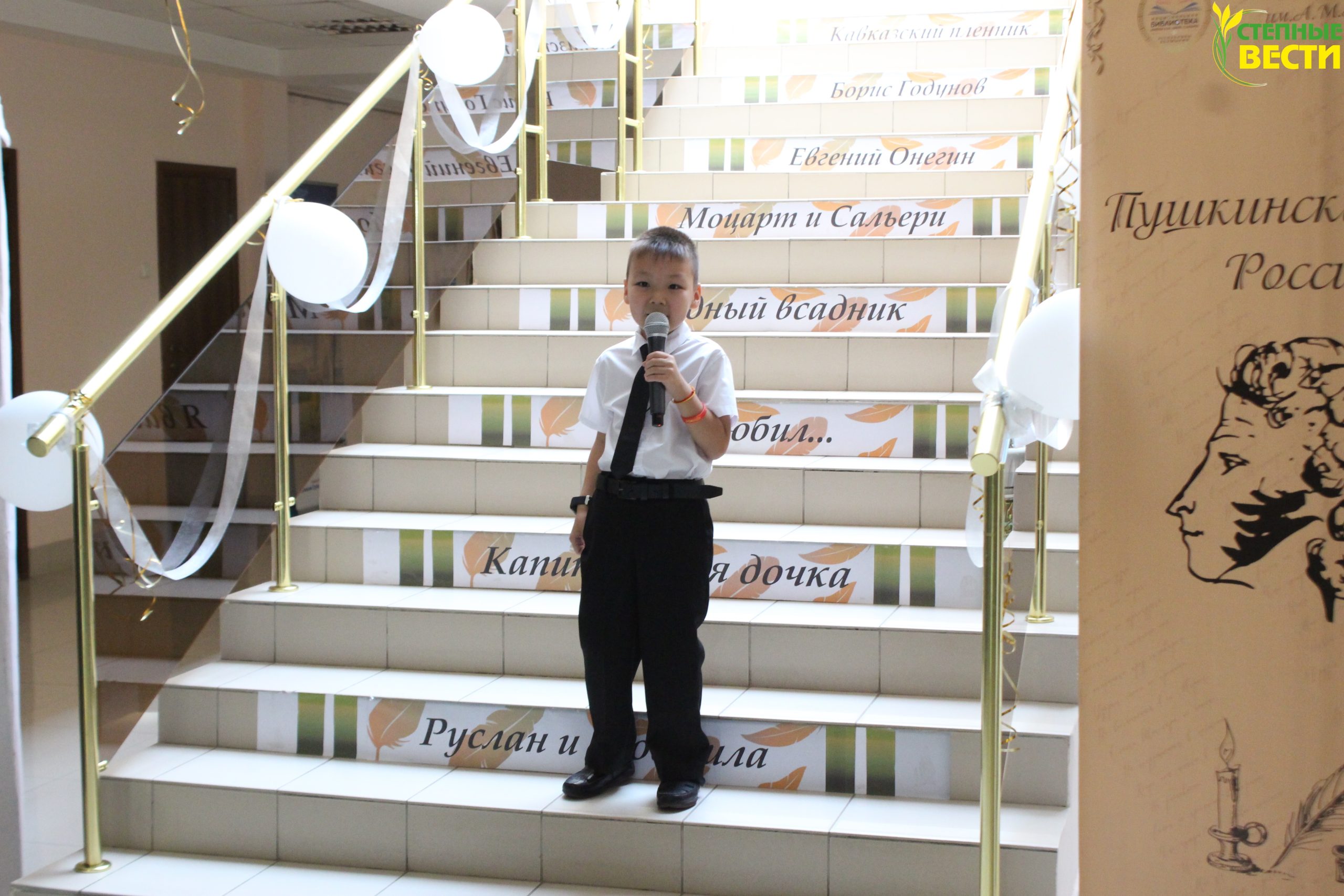 Уходящая вверх белая лестница с позолотой, украшенная белыми шарами с золотистыми лентами, создавала праздничное настроение. Шумело элистинское студенчество, сновали малыши и, конечно, шла бойкая фотосессия на лестнице, у баннера с профилем Пушкина и в уголке «Лукоморье». Вот зазвучал марш, вышел чтец с бессмертным «Я памятник себе воздвиг нерукотворный…». Праздник поэзии Пушкина начался.
