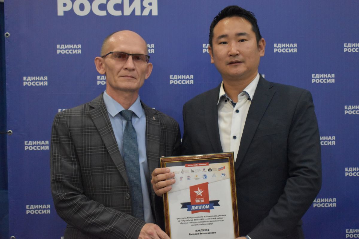Первый заместитель Руководителя Регионального исполнительного комитета Партии Олег Северцев вручил диплом и памятные подарки финалисту, набравшему максимальное количество баллов в ходе диктанта, Виталию Манджиеву.
