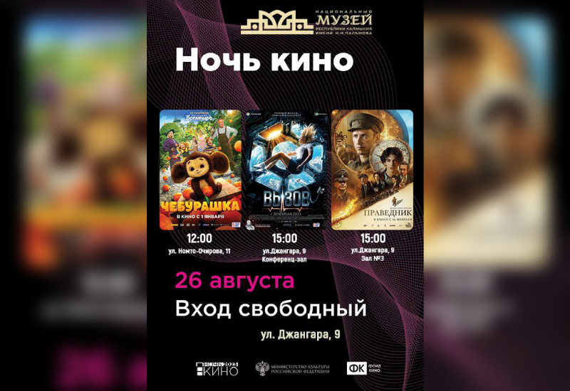 Национальный музей Калмыкии им. Н. Пальмова вновь открывает двери для всех желающих и приглашает 26 августа присоединиться к Всероссийской акции «Ночь кино».