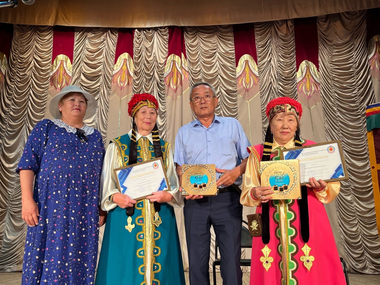Как нам стало известно, за большой вклад в развитие народного творчества республики благодарностями были отмечены ветераны народного фольклорного ансамбля "Эрктн" им. Т. Б. Алексеева - Роза Потапова, Борис Очаев и Елизавета Нимгирова.