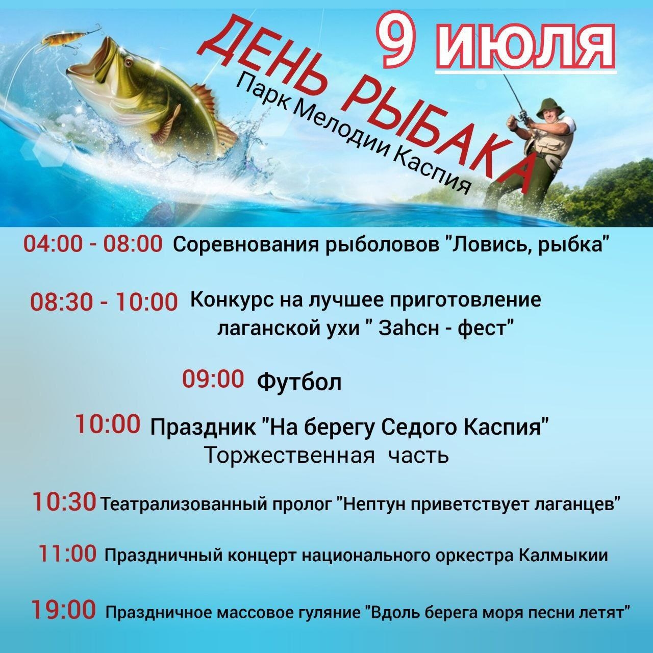 Каждое второе воскресенье июля в стране отмечают День рыбака. Традиционно праздничные мероприятия пройдут и в Лагани с раннего утра 9 июля в парке «Мелодия Каспия».