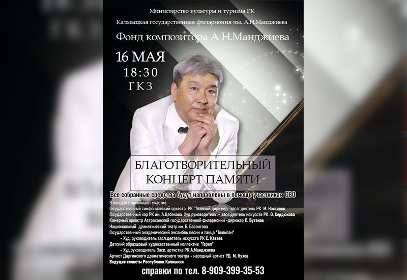 16 мая в 18.30 в Калмыцкой госфилармонии пройдёт благотворительный концерт памяти композитора Аркадия Манджиева.