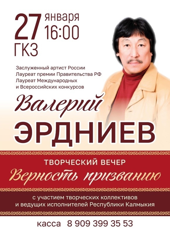 27 января Валерию Борисовичу Эрдниеву, заслуженному артисту России, лауреату премии правительства России, лауреату Всероссийских и Международных конкурсов исполняется 70 лет.
