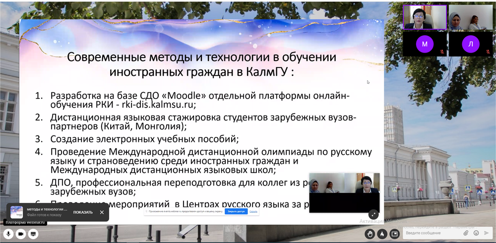 Эллара Уляевна Омакаева подготовила доклад на тему «Лингвокультурные особенности изучения духовной культуры в монгольской аудитории». Статья «Применение дистанционных технологий в обучении русскому языку как иностранному на довузовском этапе (на государственного университета им. Б.Б. Городовикова)», авторами которой выступили Любовь Алексеевна Староверкина и Ольга Николаевна Болдырева, была дополнена презентацией, из которой слушатели конференции могли узнать об инновациях, применяемых преподавателями кафедры РКИОД во время ведения занятий, а также об их новых дистанционных разработках.