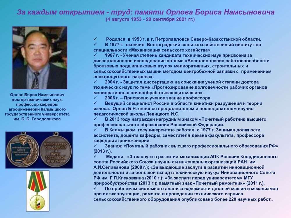 Предлагаем ознакомиться с презентацией «За каждым открытием — труд: памяти Орлова Бориса Намсыновича» http://lib.kalmsu.ru:8087/jirbis2/attachments/article/1096/Prezentaziya%20Orlov.pdf , библиографическим указателем научных трудов «В технике — доктор, в науке – профессор» http://lib.kalmsu.ru:8087/jirbis2/attachments/article/19/Orlov.pdf , подготовленными сотрудниками информационно-библиографического отдела научной библиотеки.