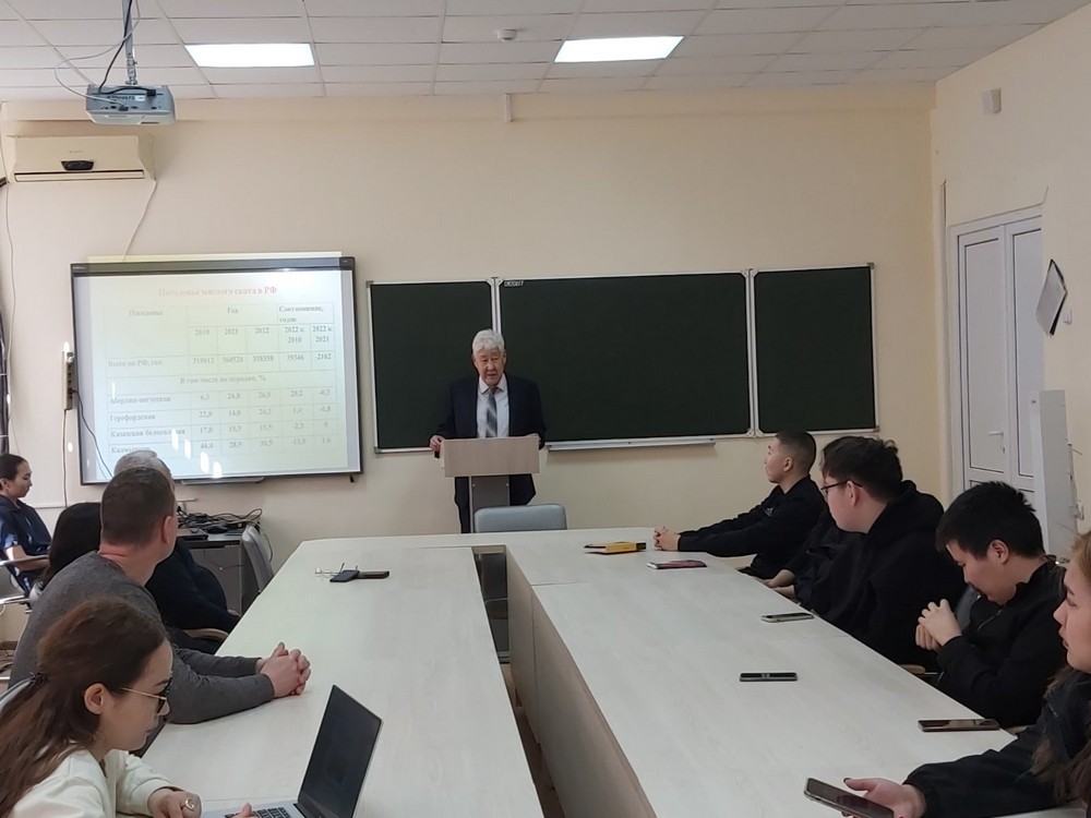 В рамках запланированных мероприятий дней науки, прошла лекция одного из ведущих ученых в области животноводства, профессора кафедры биотехнологии и животноводства, доктора сельскохозяйственных наук Убушаева Бориса Сангаджиевича. Лекция была посвящена современному состоянию мясного скотоводства, проблемам отрасли и возможности дальнейшего развития.