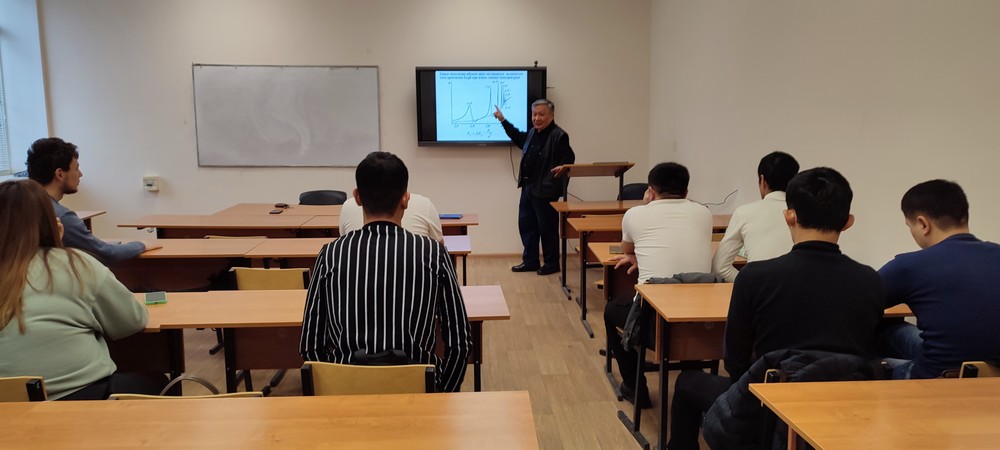 Лектор затронул вопросы, связанные с научными исследованиями кафедры, которой он сейчас руководит. Александр Сергеевич продемонстрировал студентам ряд ключевых научных статей по оптическим и фотоэлектрическим свойствам полупроводниковых соединений А2В6 при низких температурах. Было продемонстрировано несколько патентов на изобретения, касающиеся научных исследований. Далее, Александр Сергеевич вкратце рассказал аудитории об экситонных состояниях, проявляющихся в полупроводниках при низких температурах. Рассматривая историю открытия этих возбужденных состояний Александр Сергеевич показал студентам диплом на открытие экситона в полупроводниках, авторами которого стали Гросс Е.Ф., Каррыев Н.А. и Френкель Я.И. После этого Александр Сергеевич продемонстрировал студентам материалы международного конгресса AMSE, проходившего в 2019 году в Осаке (Япония), где лектор сделал научный доклад, посвященный исследованию эффектов экранирования электронно-дырочного взаимодействия в спектрах фотопроводимости полупроводниковых соединений типа CdS. По завершении лекции Александр Сергеевич пожелал присутствующим студентам успехов и настойчивости в деле изучения наук.