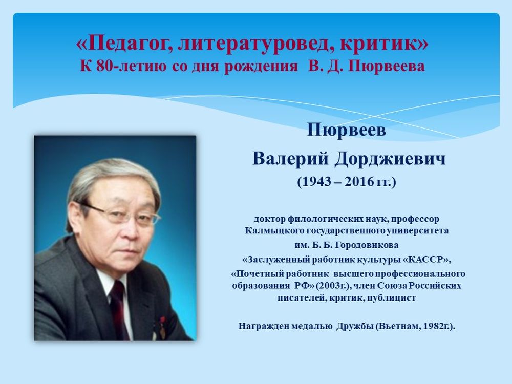 Валерий Дорджиевич Пюрвеев – известный ученый, доктор филологических наук, профессор, заслуженный работник культуры КАССР, член Союза Российских писателей, литературовед, критик, публицист.