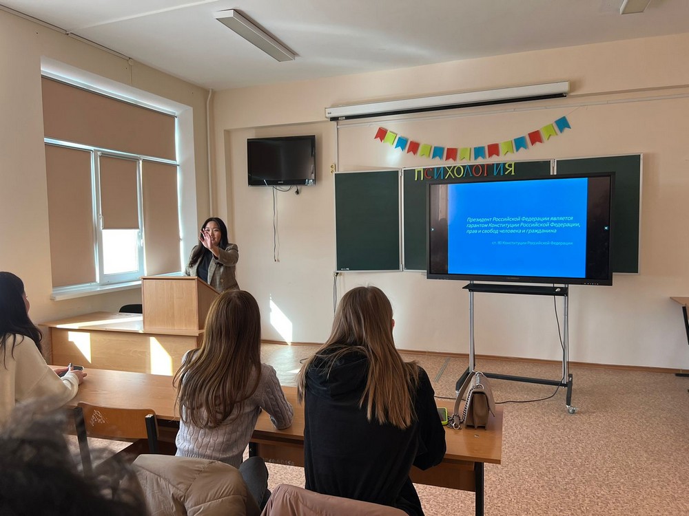 Дарина Дорджиевна рассказала студентам о ключевых полномочиях Президента как гаранта прав и свобод, стабильности правопорядка и федерализма в стране, обеспечения её суверенитета, а также об эффективности национальной системы государственной защиты прав и свобод человека и гражданина.