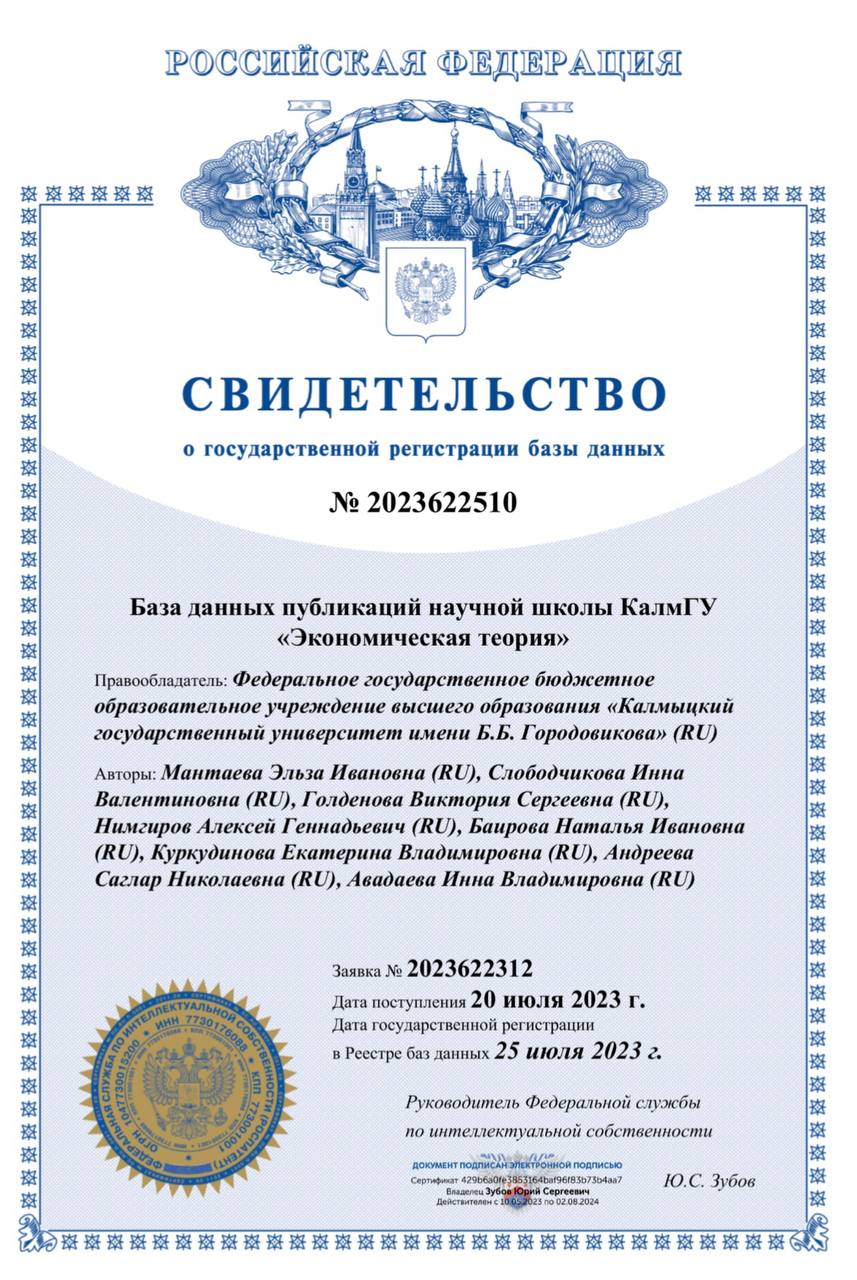 На кафедре государственного и муниципального управления и права Калмыцкого государственного университета им. Б.Б.Городовикова работает научная школа «Экономическая теория» под руководством доктора экономических наук, профессора, Заслуженного работника высшей школы РФ Мантаевой Э.И. В рамках научной школы ведутся исследования, проводятся конференции, семинары, круглые столы, мастер-классы, готовятся научные кадры и т.д. В июле 2023 года научной школой «Экономическая теория» получено свидетельство о государственной регистрации базы данных, содержащей сведения и краткие описания научных публикаций членов научной школы. Данные систематизированы таким образом, чтобы эти материалы могли быть найдены и обработаны с помощью компьютера. Базой данных могут пользоваться обучающиеся (студенты, аспиранты), преподаватели, сотрудники образовательных учреждений и любые заинтересованные пользователи.