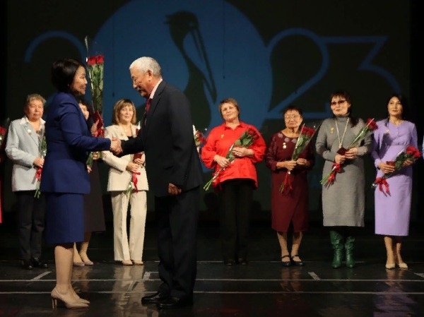 От имени Главы Республики Калмыкия Бату Хасикова лучших педагогов и ветеранов образования республики на торжественной церемонии закрытия Всероссийского Года педагога и наставника в Республике Калмыкия приветствовала Председатель Правительства Гиляна Босхомджиева.