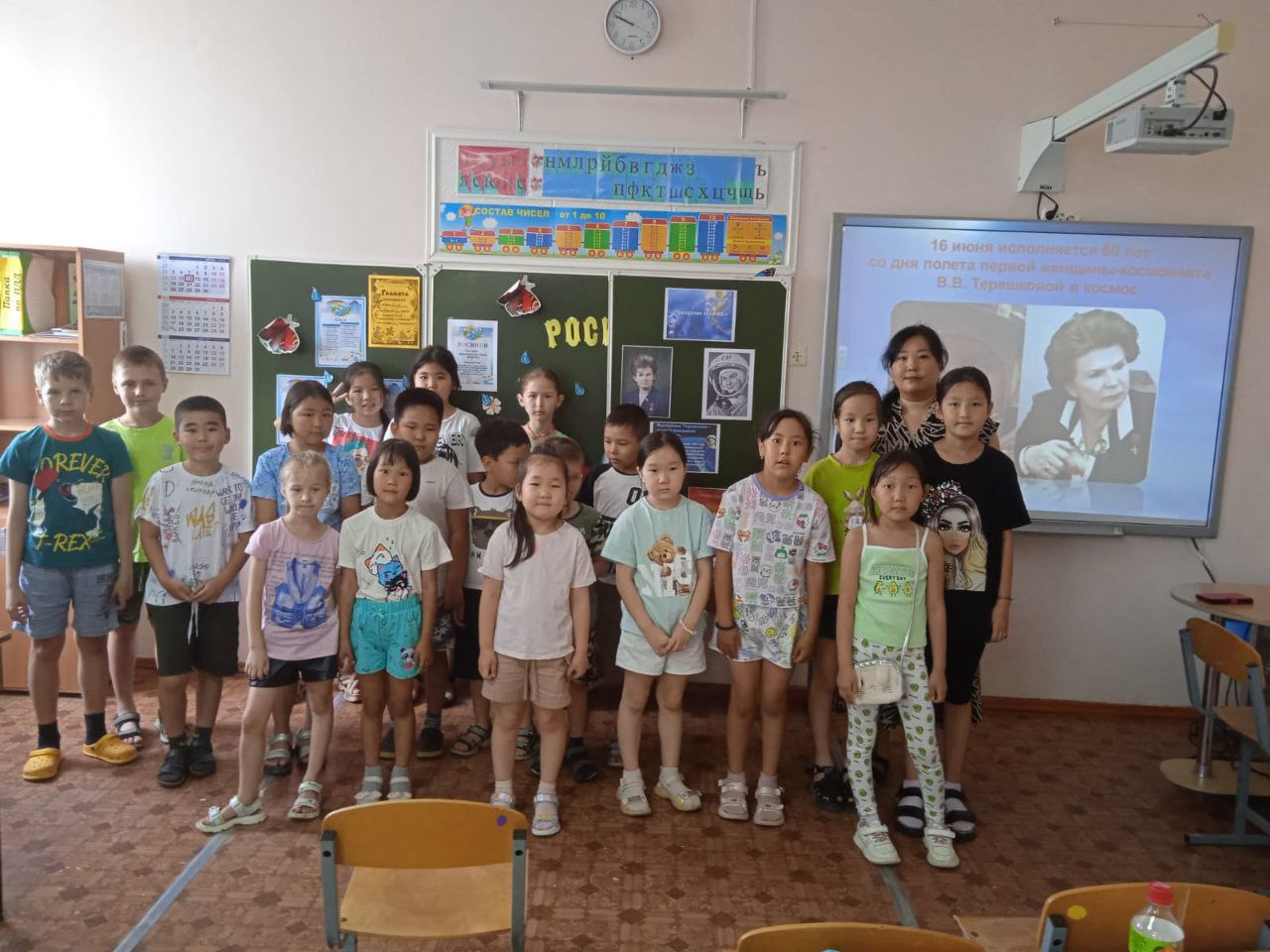 В лагере дневного пребывания «Нарн» Троицкой гимназии им. Б. Б. Городовикова Целинного района провели познавательный час «Покорение космоса». Посвятили его 60-летию первого полета женщины Валентины Терешковой в космос.