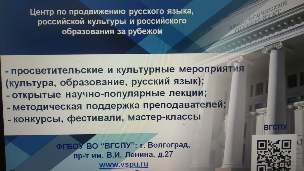 Накануне недавно созданный Центр по продвижению русского языка, российской культуры и российского образования за рубежом Волгоградского социально-педагогического университета организовал онлайн-встречу с преподавателями русского языка как иностранного и неродного за рубежом. Среди участников известный преподаватель русского языка как иностранного ( РКИ) Ольга Валентиновна Лаврова из Испании (г. Аликанте), Зарина Алиева из Бухарского государственного педагогического университета, доктор филологических наук, профессор, директор Института международного образования ВГСПУ Дмитриева Ольга Александровна, декан ФДПОИГ, доцент, куратор Центра русского языка и культуры КалмГУ Староверкина Любовь Алексеевна и многие другие.