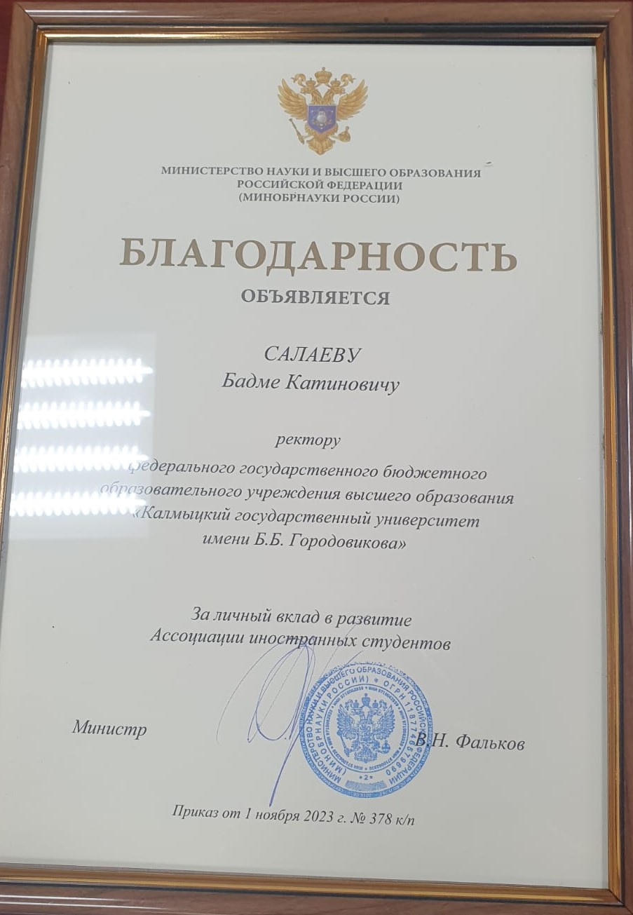Благодарность министерства науки и высшего образования РФ объявлена ректору КалмГУ Бадме Салаеву. Грамотой за подписью отраслевого министра Валерия Фалькова отметили вклад калмыцкого вуза в развитие международной деятельности.