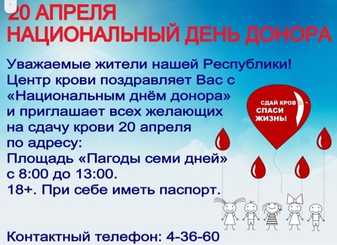 20 апреля в России отмечается национальный День донора. Региональный Центр крови приглашает жителей республики отметить праздник сдачей крови.