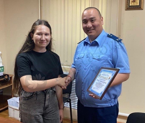 Прокурор Яшалтинского района Церен Бадма – Горяев поздравил школьницу и торжественно вручил ей сертификат Генеральной прокуратуры Российской Федерации победителя Всероссийского конкурса.