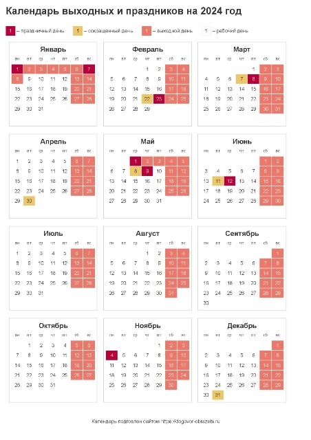 Минтруд России опубликовал календарь рабочих и праздничных дней в 2024 году.