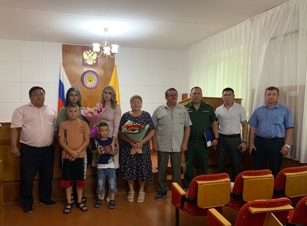 В селе Приютное глава района Басан Манжиков и заместитель военного комиссара Ики-Бурульского и Приютненского районов Мерген Маслов вручили орден Мужества семье Андрея Могилева.