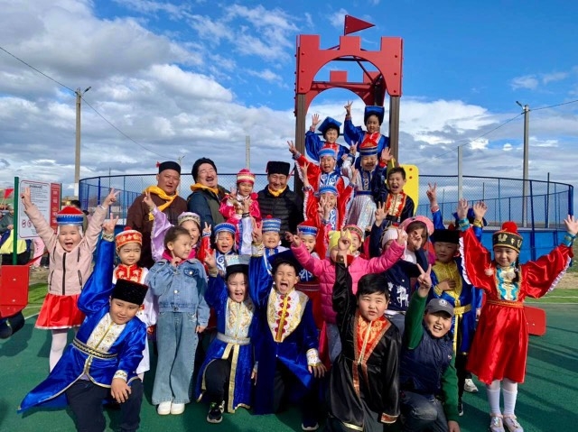 Вместе с детьми на торжественном открытии красную ленточку перерезали глава Кетченеровского района Санал Годжуров и депутат Госдумы, хирург Бадма Башанкаев, по инициативе которого была установлена детская площадка.