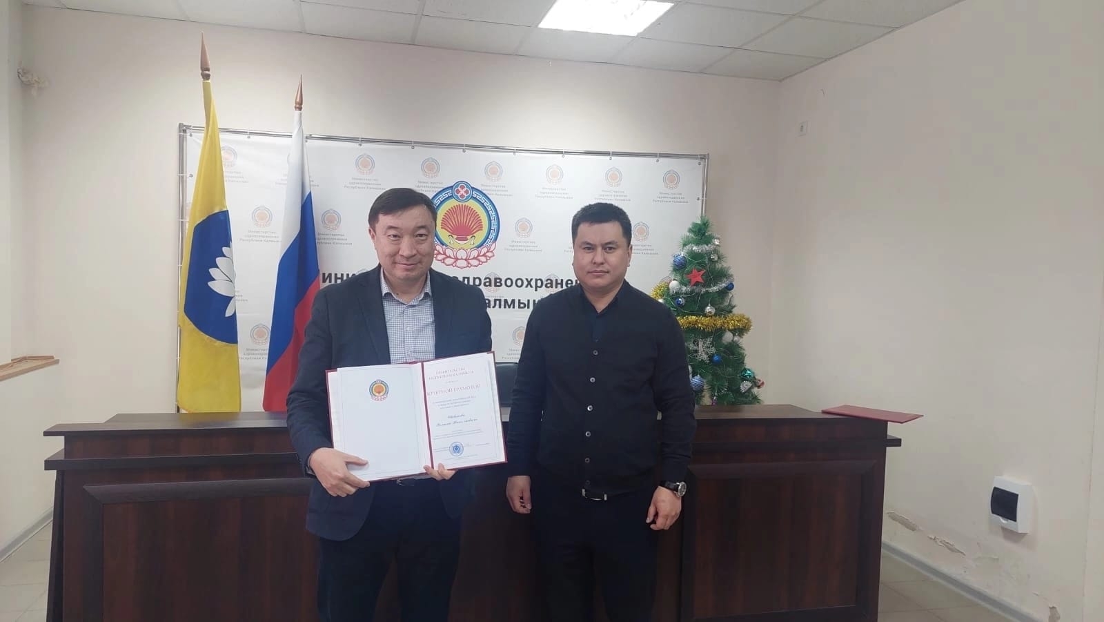 От имени руководителя кабинета министров вручил Почетную грамоту Правительства Калмыкии руководителю отдела правового обеспечения и делопроизводства Минздрава Роману Николаевичу Шевенову".