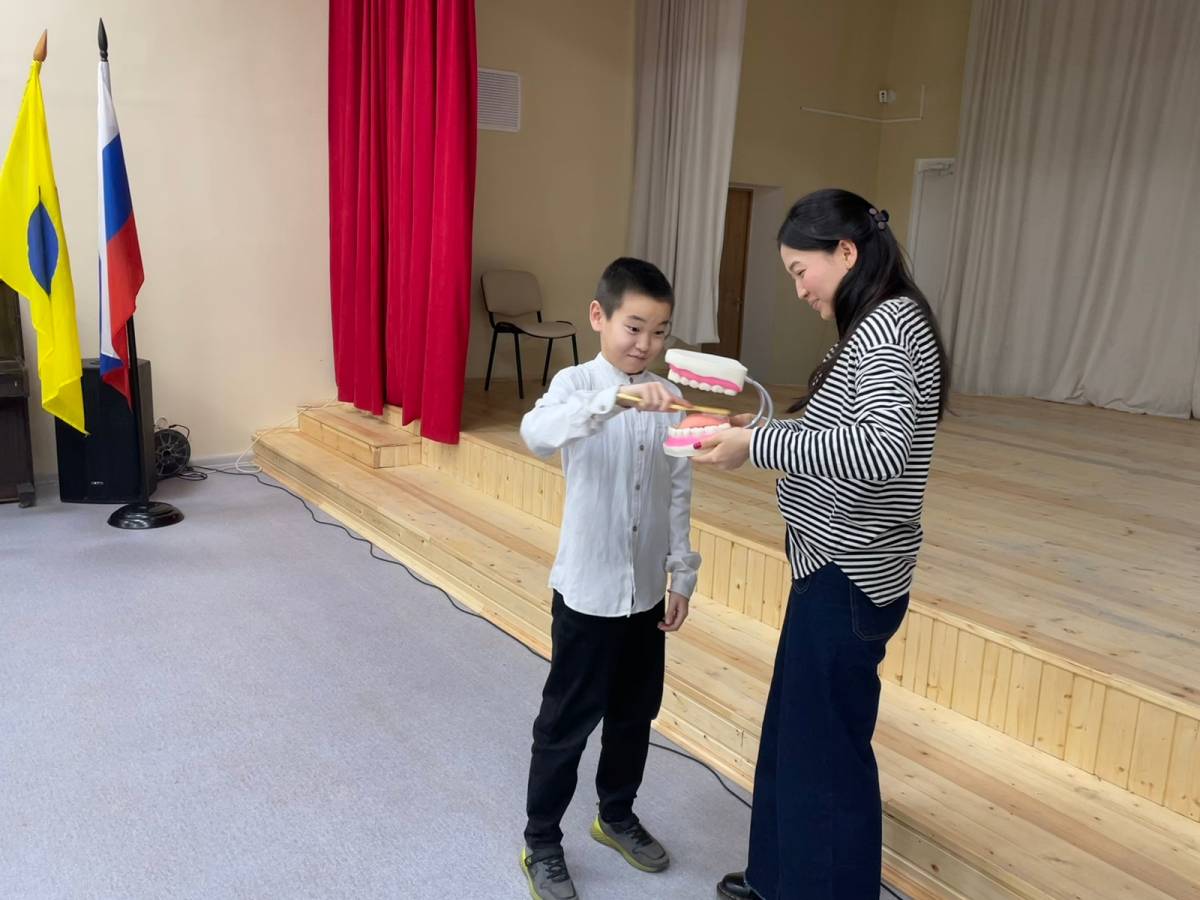 Врач Республиканской Стоматологической поликлиники Арина Бокушева рассказала детям о здоровье зубов и уходе за полостью рта.