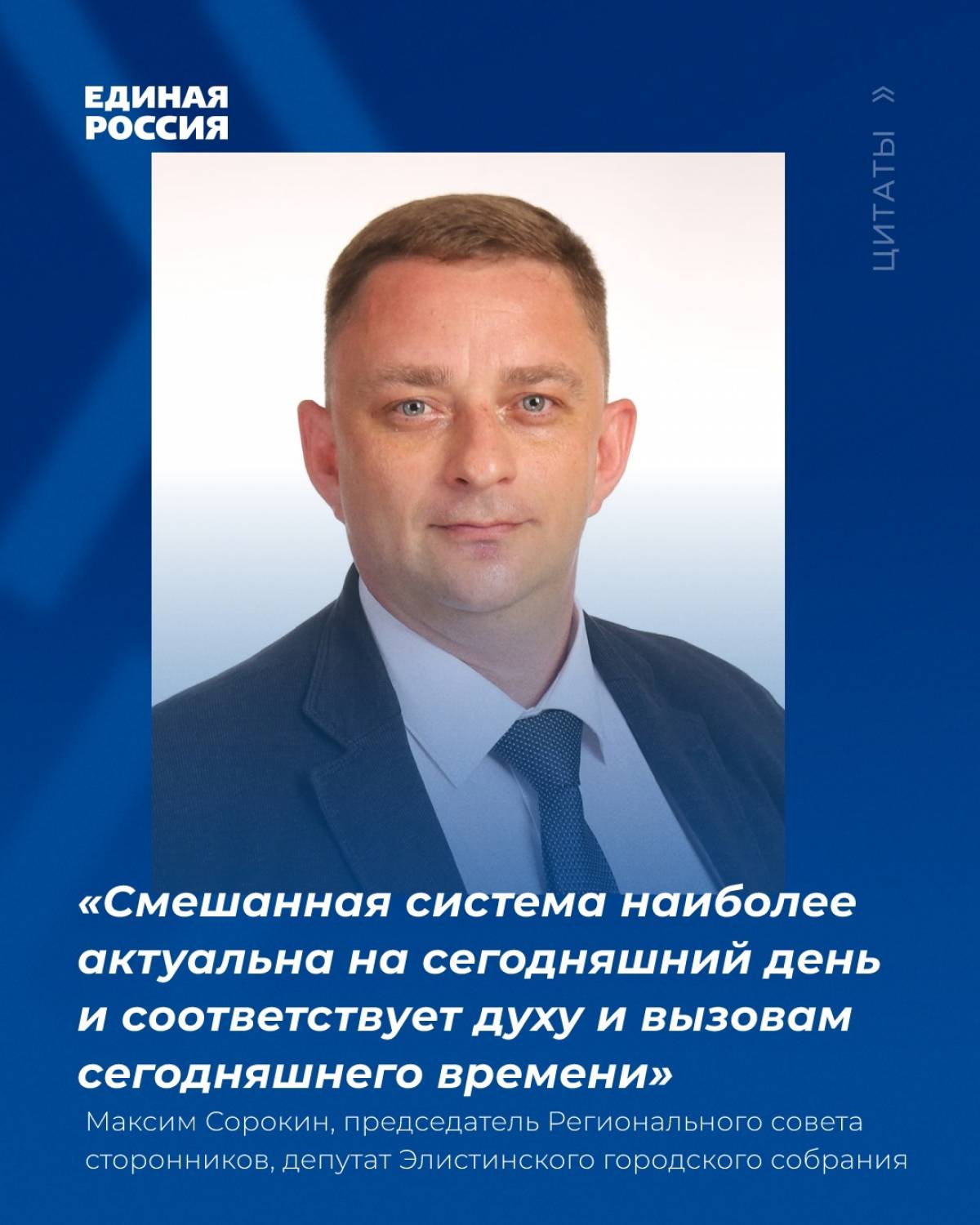 «На встрече с молодежью Бату Хасиков объявил о смене избирательной системы Калмыкии. Переход от списочной системы к смешанной, когда у нас будет 17 депутатов по одномандатным округам и 10 по спискам. Вкратце о плюсах, каждый кандидат должен будет «ногами» пройти по округу, поговорить с жителями, сформировать программу, показать свои дела и самое главное - будет нести персональную ответственность за выполнение своей программы. Также теперь даже маленькие партии имеют возможность представить своего кандидата. также станет более понятная система подсчета голосов и выборов, когда люди голосуют за своего кандидата. Времена обещаний прошли, наступило время молодых и деятельных людей», - отметил Максим Сорокин.