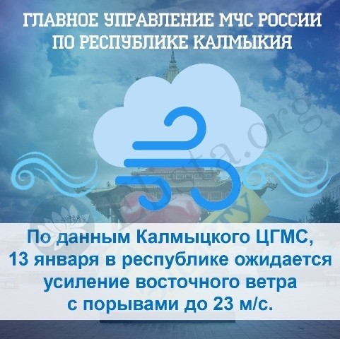 По данным Калмыцкого ЦГМС, 13 января в республике ожидается усиление восточного ветра с порывами до 23 м/с.
