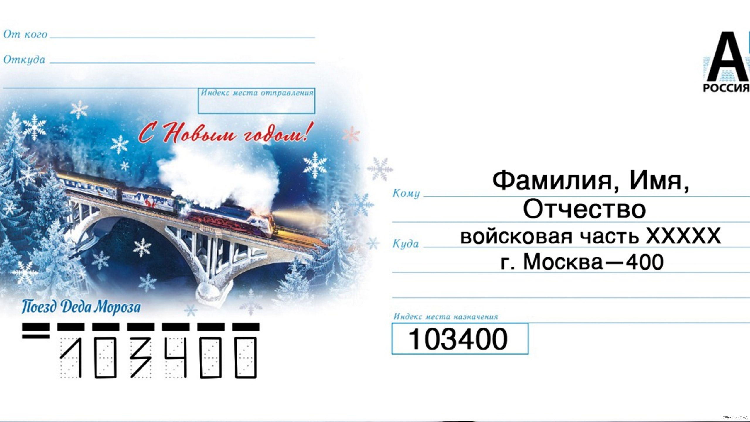 Доставка почтовой корреспонденции военнослужащим осуществляется на безвозмездной основе (посылки весом до 10 кг), через отделения Почты России, с указанием адреса: 103400, г. Москва, номер воинской части, фамилия, имя, отчество военнослужащего.