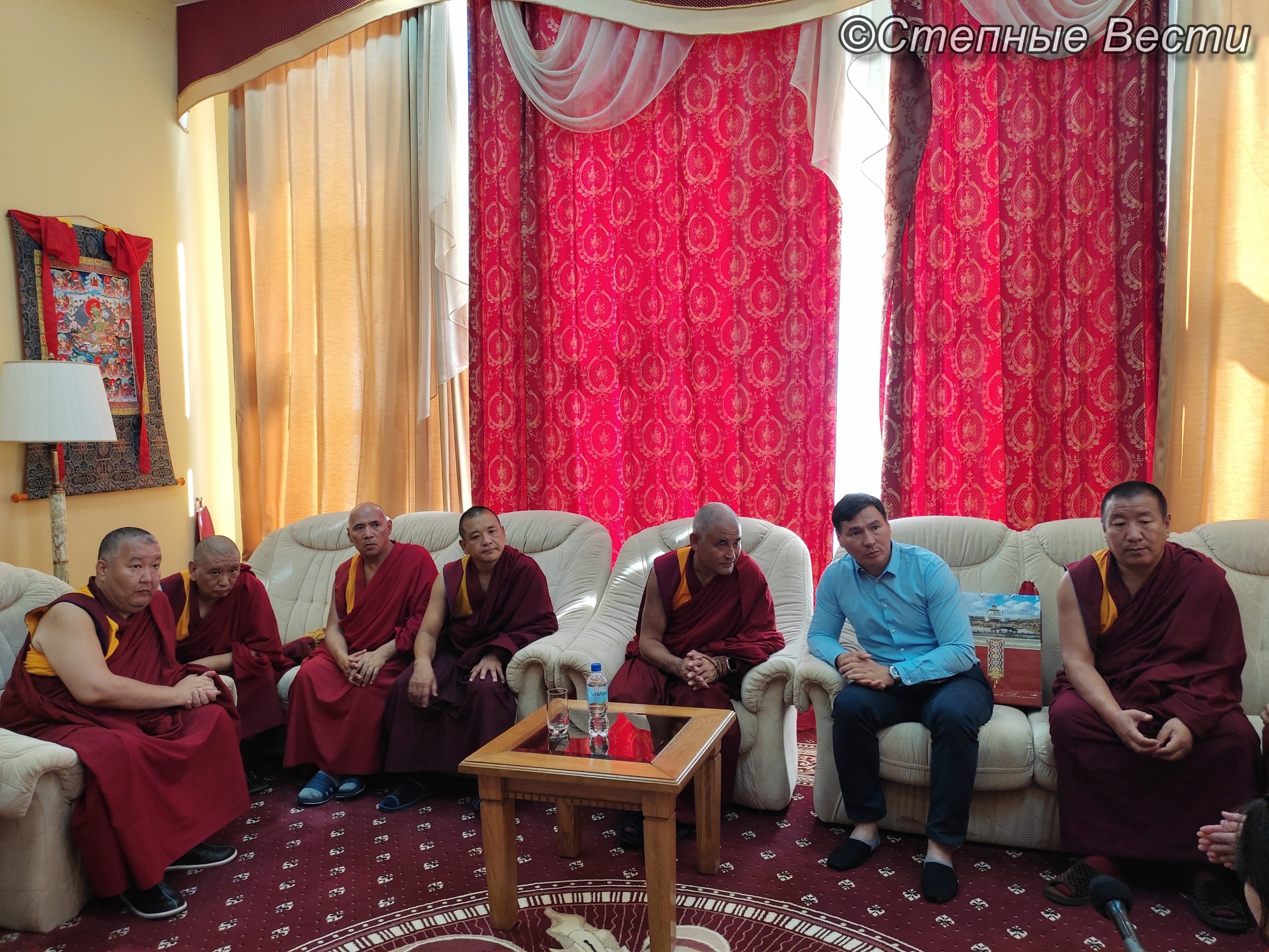 Как мы уже сообщали , досточтимый Кхен-Ринпоче прибыл в республику с официальным визитом 29 августа. Знакомство с регионом он начал с Малых Дербет, где провел молебен и даровал краткие наставления и передачу мантр. Утром 30 августа Его Преосвященство уже участвовал в молебне в центральном хуруле Калмыкии. Он провел встречи с шаджин-ламой, монашеской сангхой и руководством республики. Бату Хасиков назвал визит геше-лхарамбы знаковым событием для всех жителей Калмыкии.