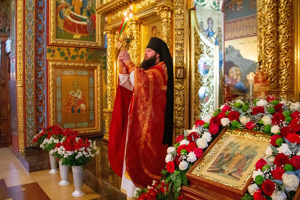 После Высокопреосвященный Юстиниан поблагодарил прихожан за совместную молитву, а также поздравил клирика Казанского собора иеродиакона Герасима (Кудрявцева) с днем рождения и преподнес священнослужителю памятный подарок.