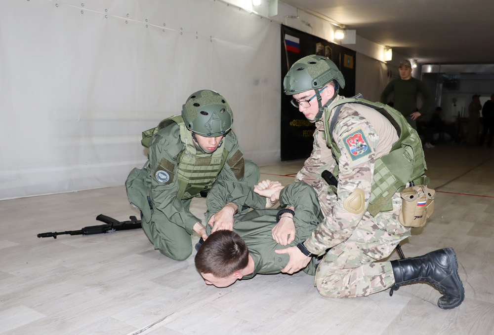 В тире гимназии одни курсанты отрабатывали задание по захвату «террориста», другие – собирали автомат Калашникова. Здесь также стреляют из пневматической винтовки. Днем раньше проходили «бои» на полосе препятствий РНГ, сопровождаемые грохотом стрельбы из выхолощенного оружия и дымовой завесой. Ребята также занимаются строевой подготовкой и оказанием первой медицинской помощи.