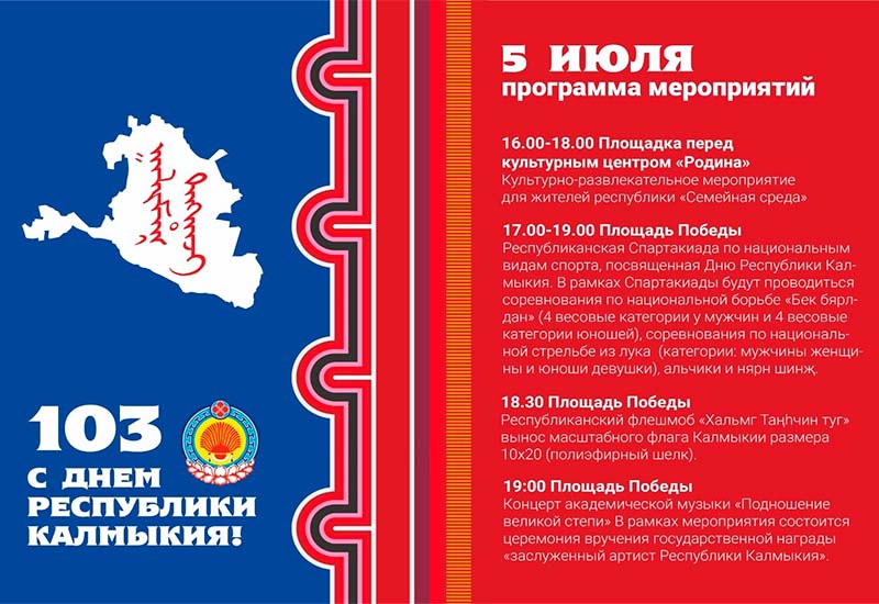 Согласно праздничной программе, которой поделилась пресс-служба Министерства культуры и туризма, в этот день жителей и гостей столицы Калмыкии будет ожидать масштабное празднование.