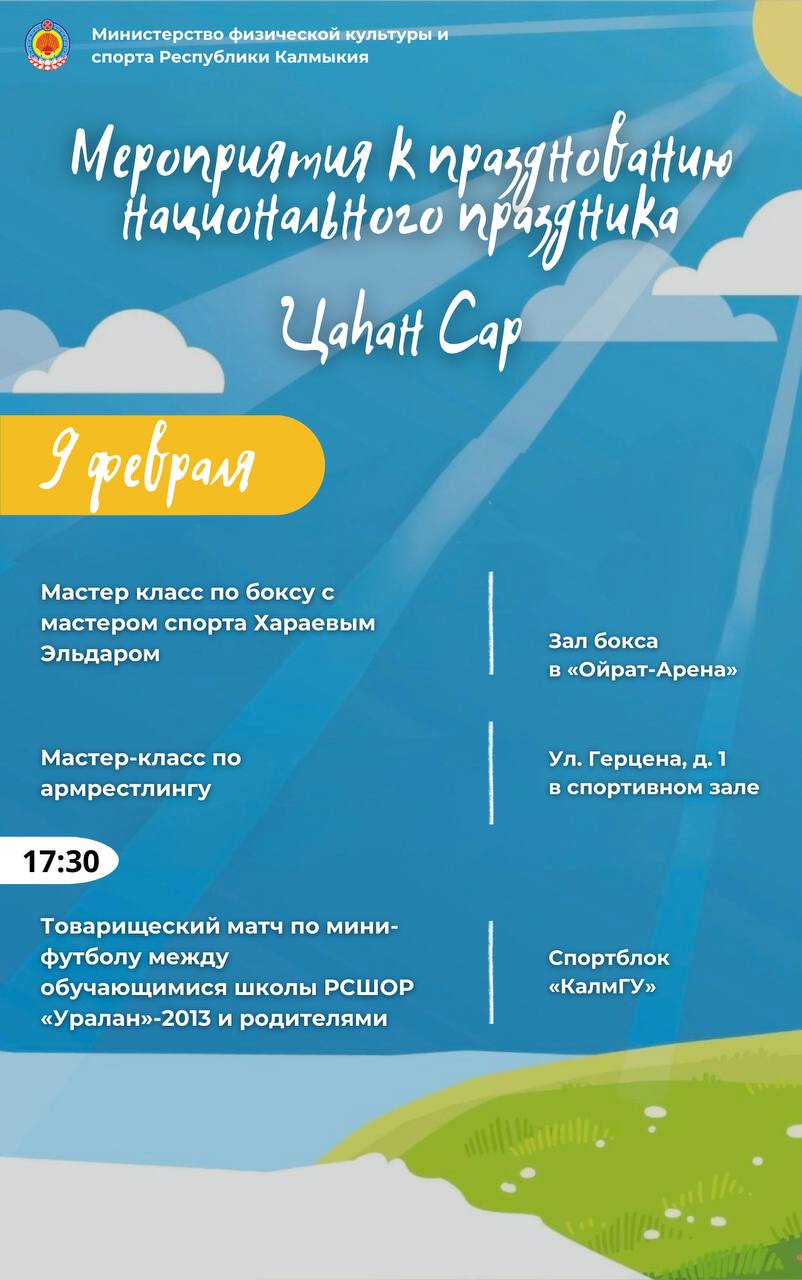 С 9 по 11 февраля в Элисте пройдет ряд мероприятий, приуроченных к празднованию национального праздника, сообщает пресс-служба минспорта РК.