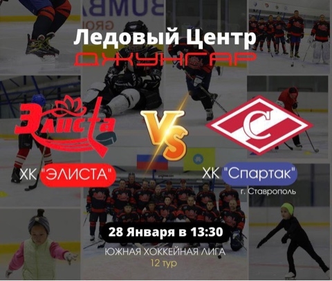 Сегодня, 28 января в 13:30 в ледовом центре «Джунгар» состоится хоккейный матч в рамках Южной хоккейной лиги (12 тур) между командами «Элиста» и «Спартак» из г. Ставрополь.