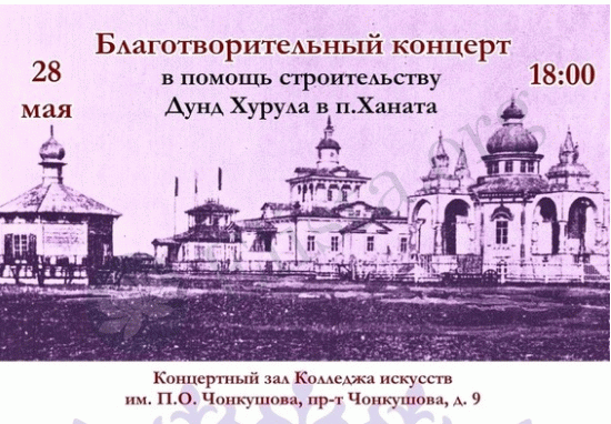 В Большом концертном зале колледжа искусств имени Петра Чонкушова состоится Благотворительный концерт в помощь строительству Дунд Хурула в посёлке Ханата.