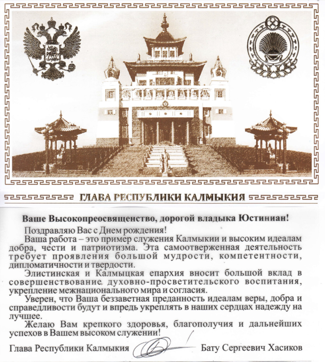 В поздравлении глава региона назвал служение архиепископа Юстиниана примером «служения Калмыкии и высоким идеалам добра», а также отметил вклад Элистинской епархии «в совершенствование духовно-просветительского воспитания, укрепления межнационального мира и согласия»